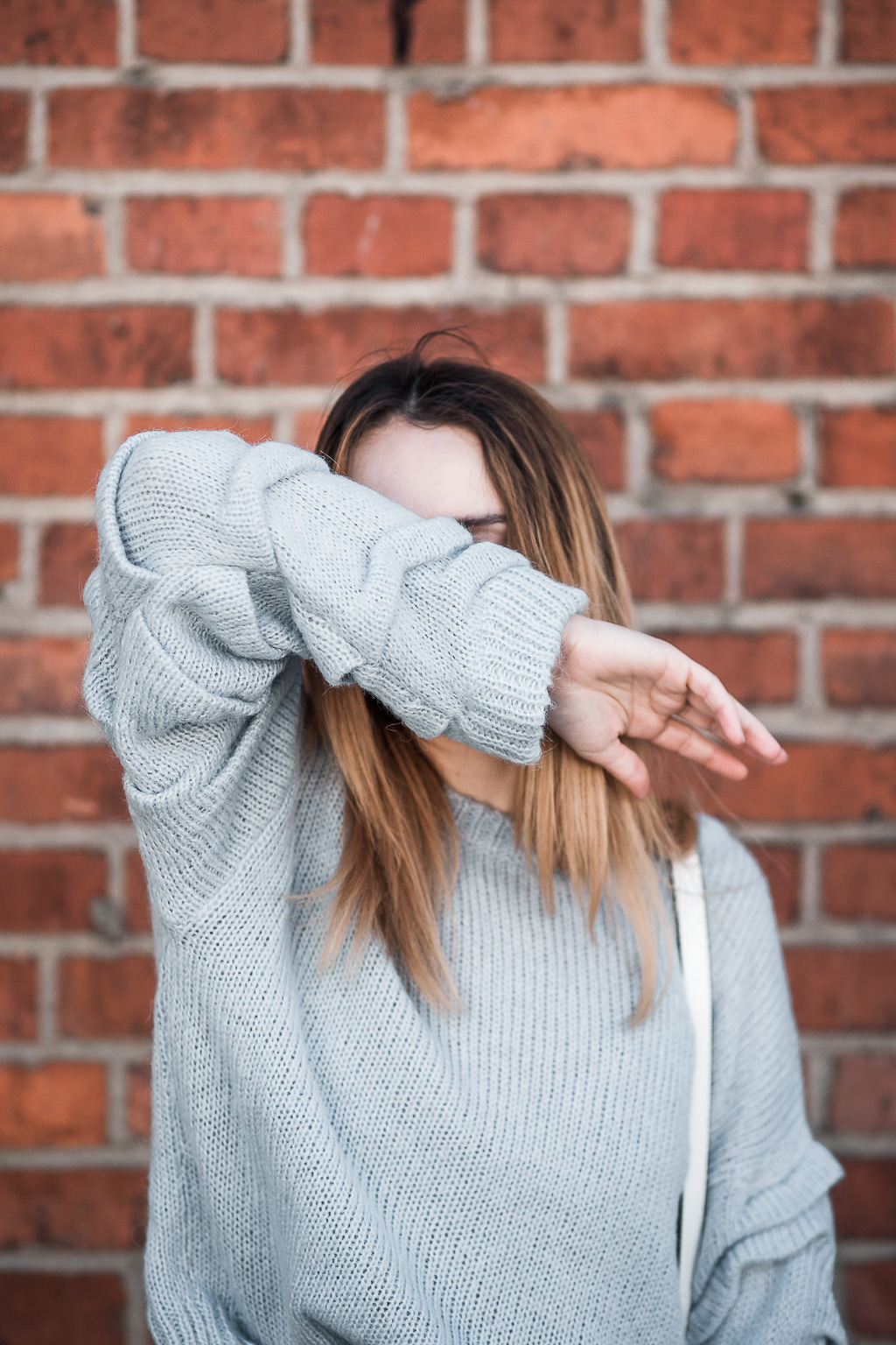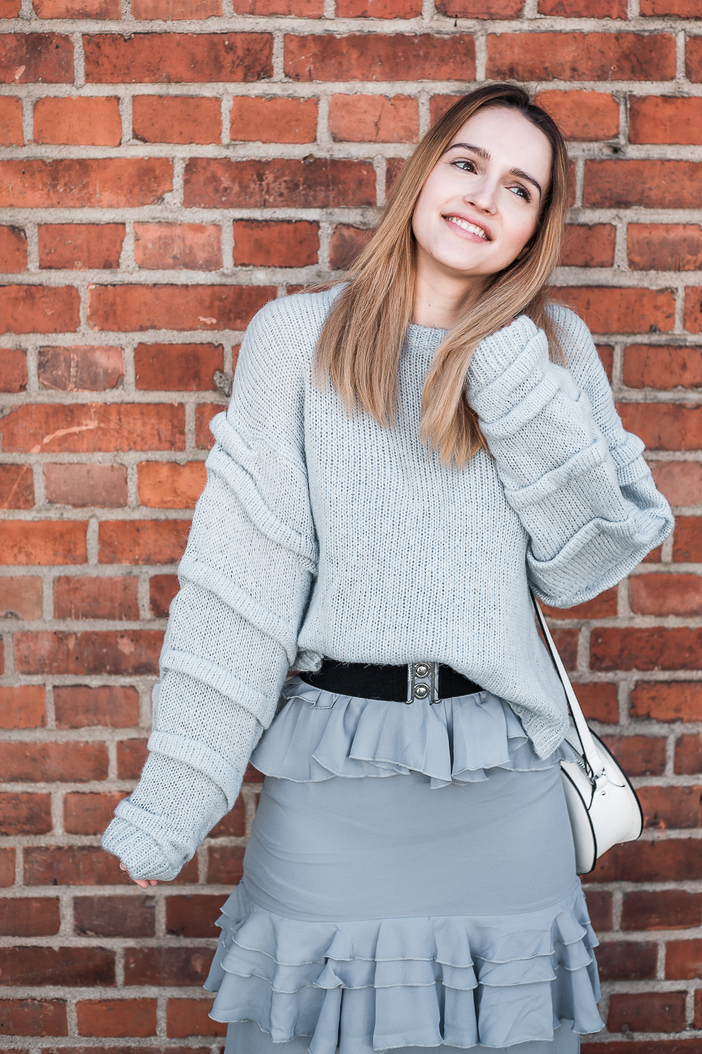 Oder auch gleich und gleich gesellt sich gerne. Blau passt einfach super zu Blau, ob ihr nun helle oder dunkle Töne kombiniert oder beides mischt, die Harmonie stimmt. Ich habe hier ein hell-blaues Volantkleid mit einem kuscheligen hellblauen Pullover kombiniert. Die beiden Blau-Töne harmonieren und das Sommer-Feeling samt Spaziergang an der Promenade macht sich breit.
