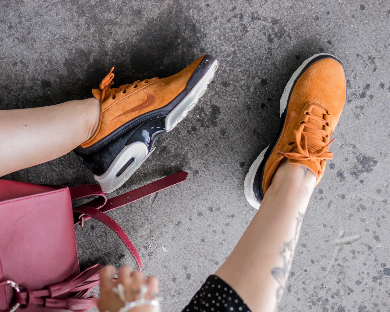 Mein Outfit hat durch die Details des Jumpsuit, wie die Rüschen-Volants an den Armen bereits einen sehr verspielten, feminin Touch. Daher hab ich als Stilbruch sportliche Sneaker gewählt, damit das Outfit noch eine zweite modische Komponente als Ausgleich erhält. Ich liebe aber auch die Kombination von verspielt und sportlich mit einem Hauch Eleganz. Die Schuhe habe ich übrigens bei einem spontanen Ausflug zum Fashion-Outlet Zweibrücken entdeckt und war schock verliebt.