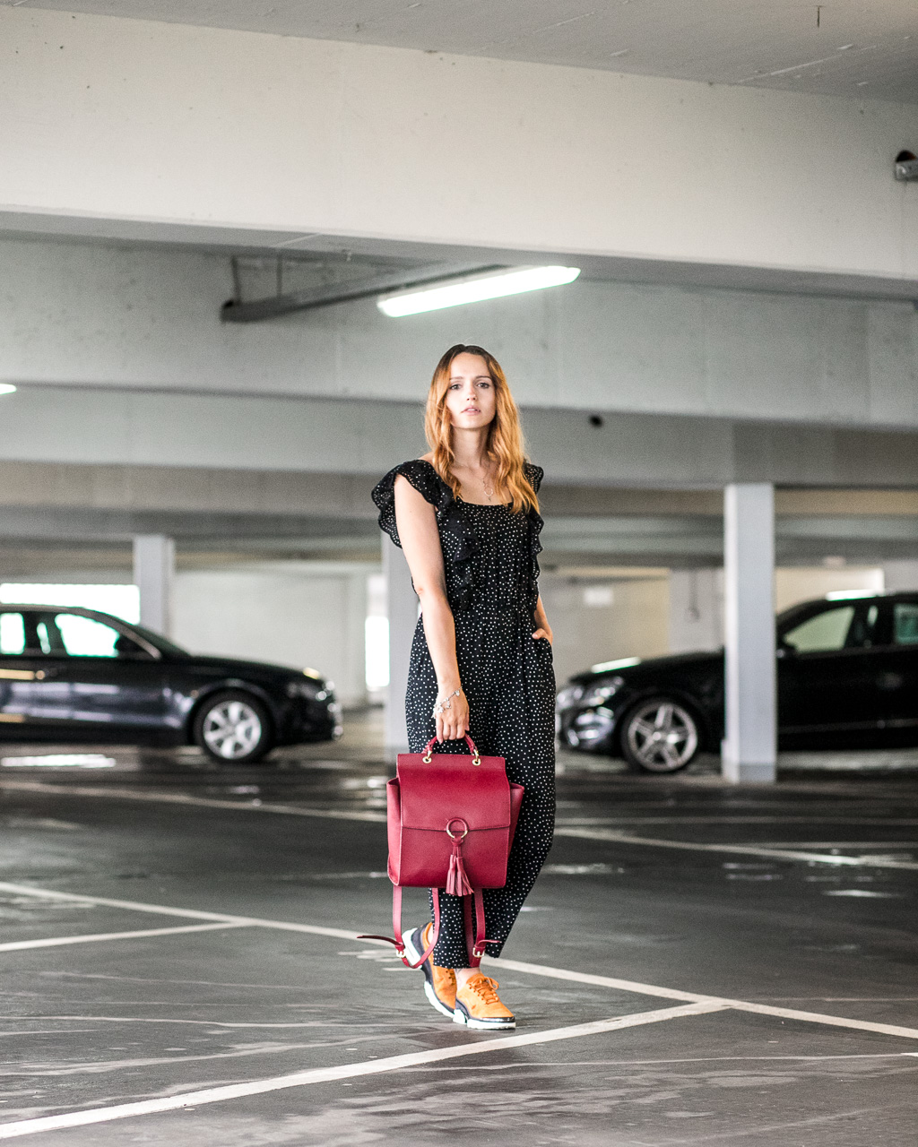 Der große Vorteil bei einteiligen Outfits wie Jumpsuits (oder auch Kleidern) ist eindeutig, dass man sehr schnell einen Look kreieren kann. Dabei ist wichtig, dass der Look trotz so weniger Teile auch spannend wird. Entweder also den Einteiler als Highlight einsetzen oder mit Accessoires das Outfit aufpeppen. Bei mir kommt Farbe durch Schuhe und Tasche ins Spiel, um dem Outfit das gewisse Etwas zu geben. Zu den gepunkteten, verspielten Jumpsuit hab ich deswegen farbige Sneaker und ein Rucksack als Eyecatcher kombiniert, fertig ist mein sporty chic Look! Eure Tiffy