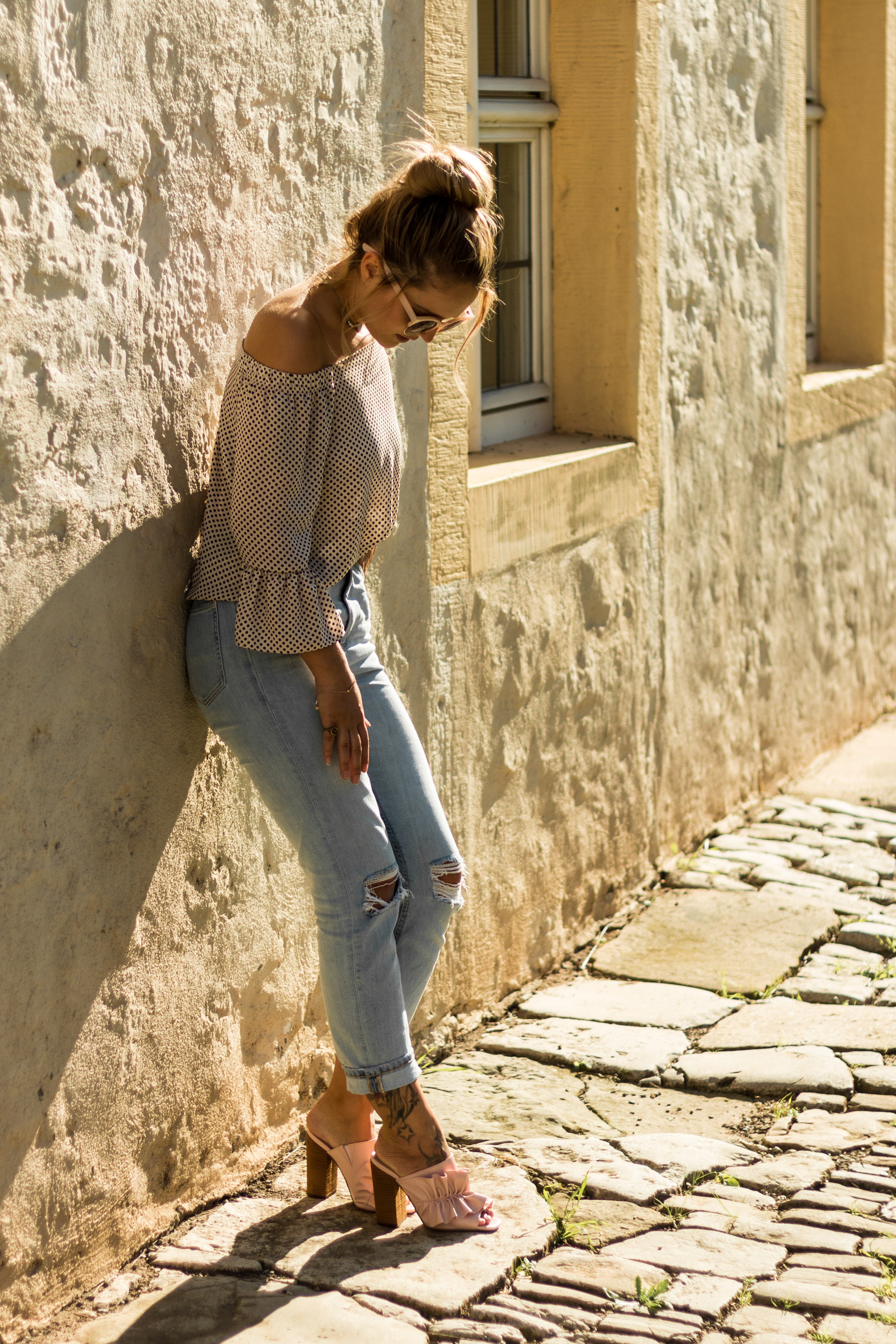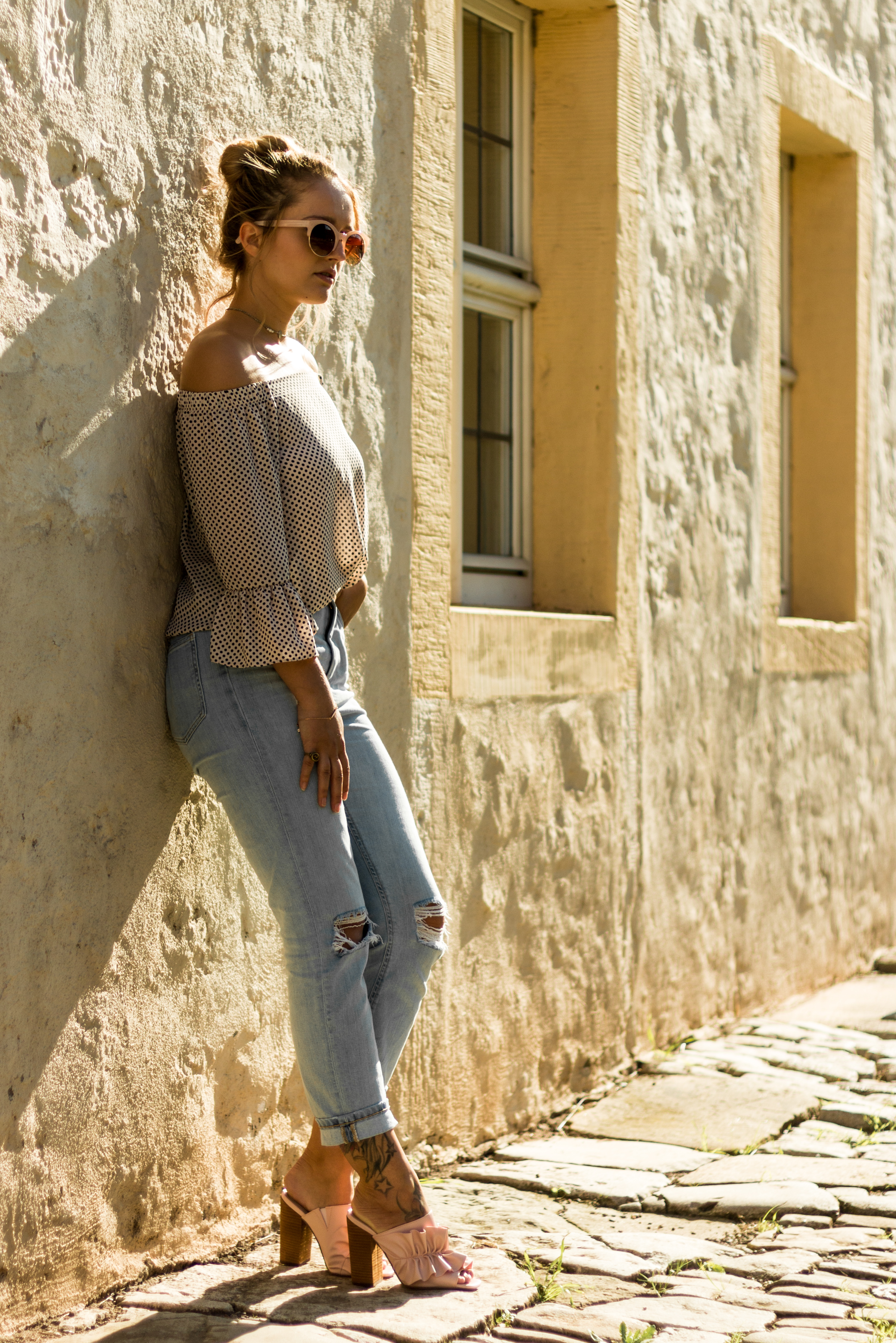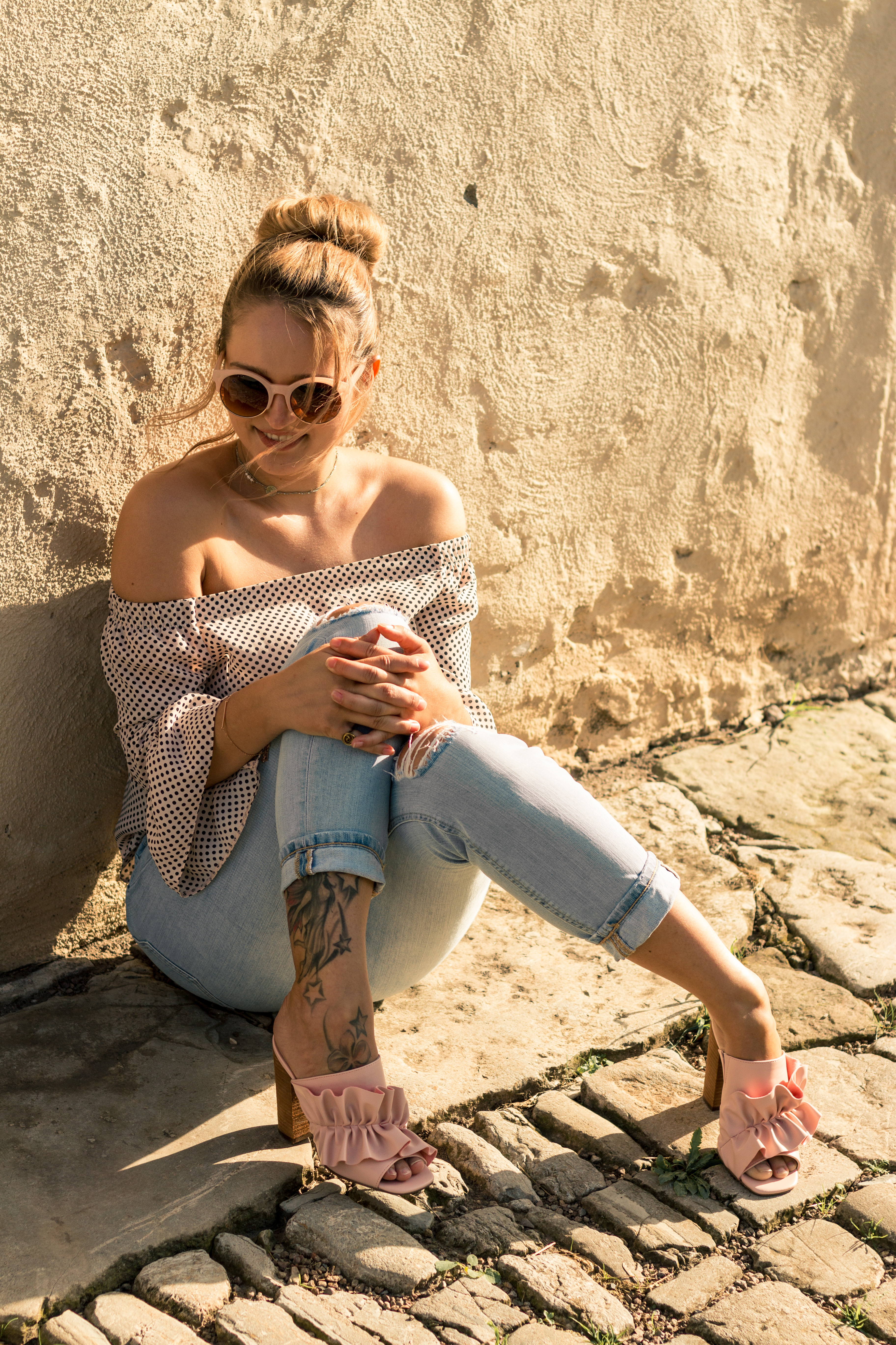 Heute gibt es einen simplen Lieblingslook von mir, der chic & casual zugleich ist. Die Destroyed Jeanshose und Jeansjacke sind absolute Klassiker, die super bequem und lässig sind. Die Hosenbeine sind einmal hochgekrempelt, das streckt optische die Beine. Die Offshoulder-Bluse mit Volant-Ärmel ist mein Summer-Must-Have für dieses Jahr und macht das Outfit modern und edel zu gleich. Die rosa, gerüschten Slipper sind ein super Eye-Catcher und dürfen nicht fehlen!❤ Schöne Woche euch, eure Tiffy