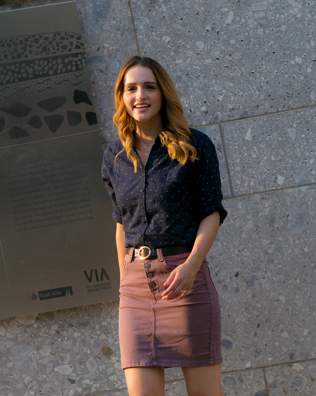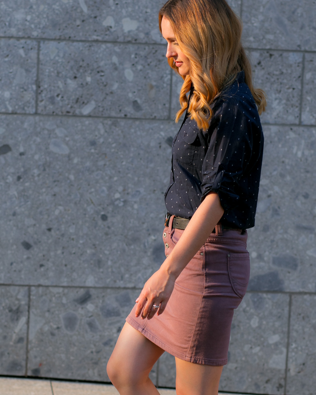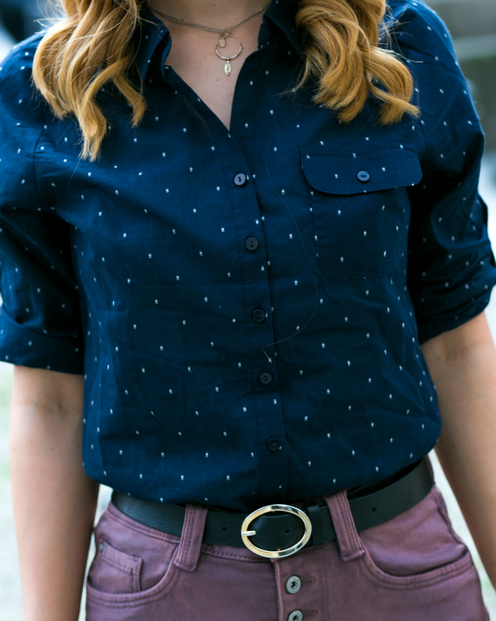 Ich bin meist vorsichtig beim Kombinieren von zwei Farben, besonders wenn das ganze Outfit daraus besteht. Jedoch passen dunkles Blau und Altrosa einfach so super zusammen, dass ich diese dunkelblaue Bluse mit Punkten zu dem Rock kombinieren musste.