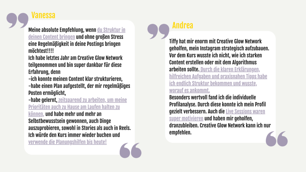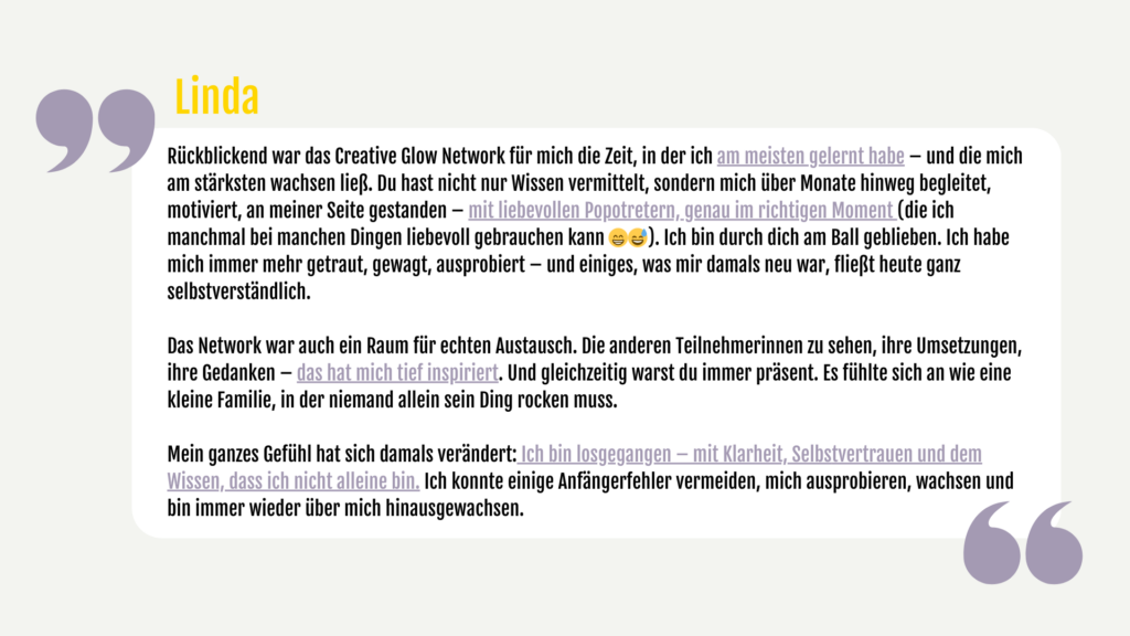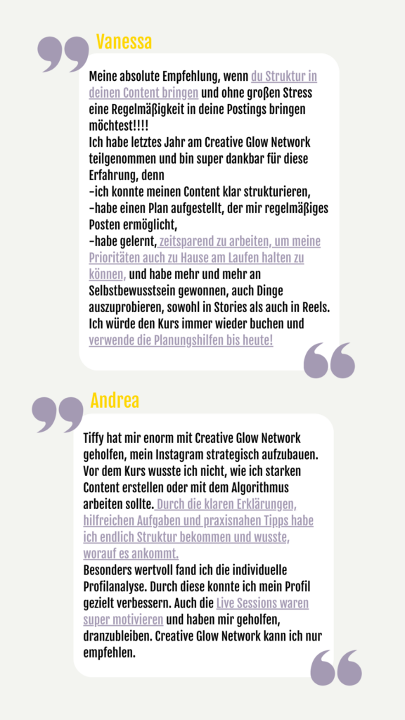 … für sich und ihre Träume los geht. Die jetzt den ersten Schritt macht und merkt: Genau DAS habe ich gebraucht! The Female Glow Network verbindet Strategie, Umsetzung & Gemeinschaft mit Herz, Seele & Wachstum im Innen & Außen – damit du nicht nur auf Instagram glänzt, sondern dich auch im echten Business-Alltag getragen und gestärkt fühlst. Finde in 3 Monaten deine Stimme und deinen Weg auf Social Media – individuell und unverwechselbar. Du hast jetzt eine letzte Chance dabei zu sein – nur 5 Plätze sind frei!