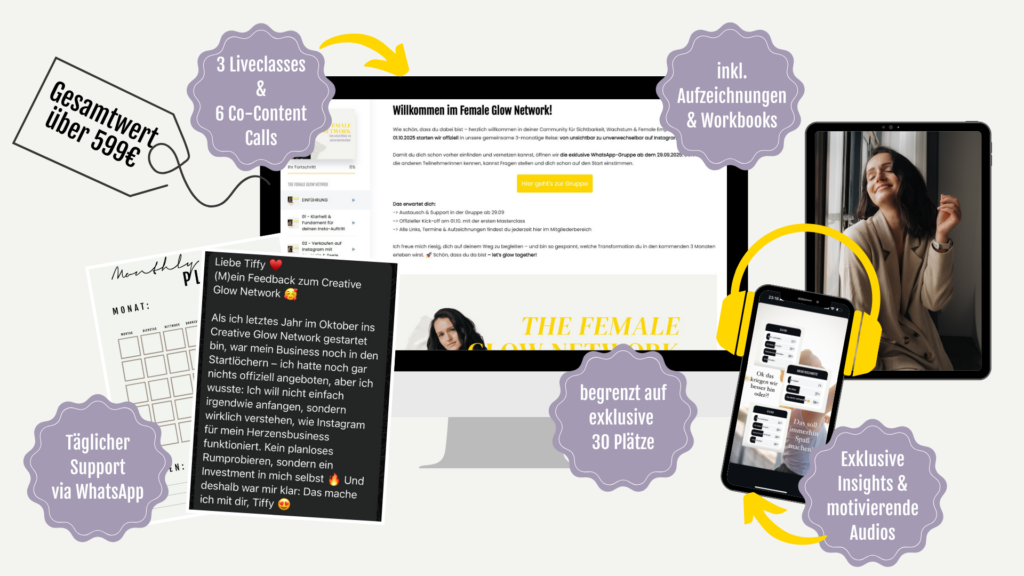 Im Female Glow Network bekommst du bis Ende Dezember 2025 genau die Mischung aus Input, Umsetzung & Support, die dich wirklich voranbringt: einem Content, der sichtbar wird, überzeugt & verkauft.