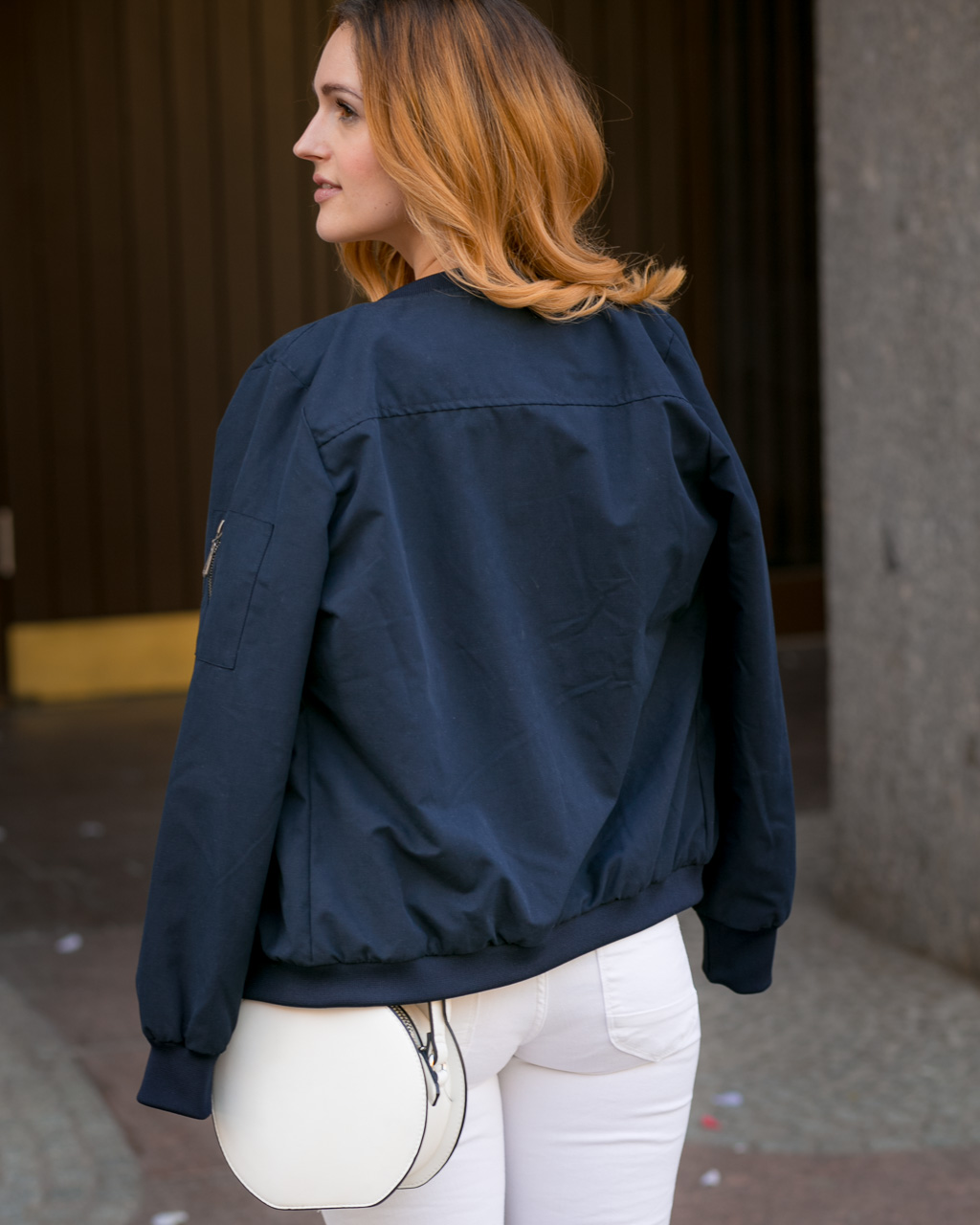 Für den perfekten Tages-Look fehlt natürlich noch eine Jacke, denn es kann auch mal etwas kälter sein am Morgen. Hier habe ich als farbliches Element einen dunkelblauen Blouson gewählt, welcher ein lässiges Trend-Piece ist, dass nicht aus der Mode kommt. Besonders raffiniert ist die kleine Tasche mit Reißverschluss am Ärmel.